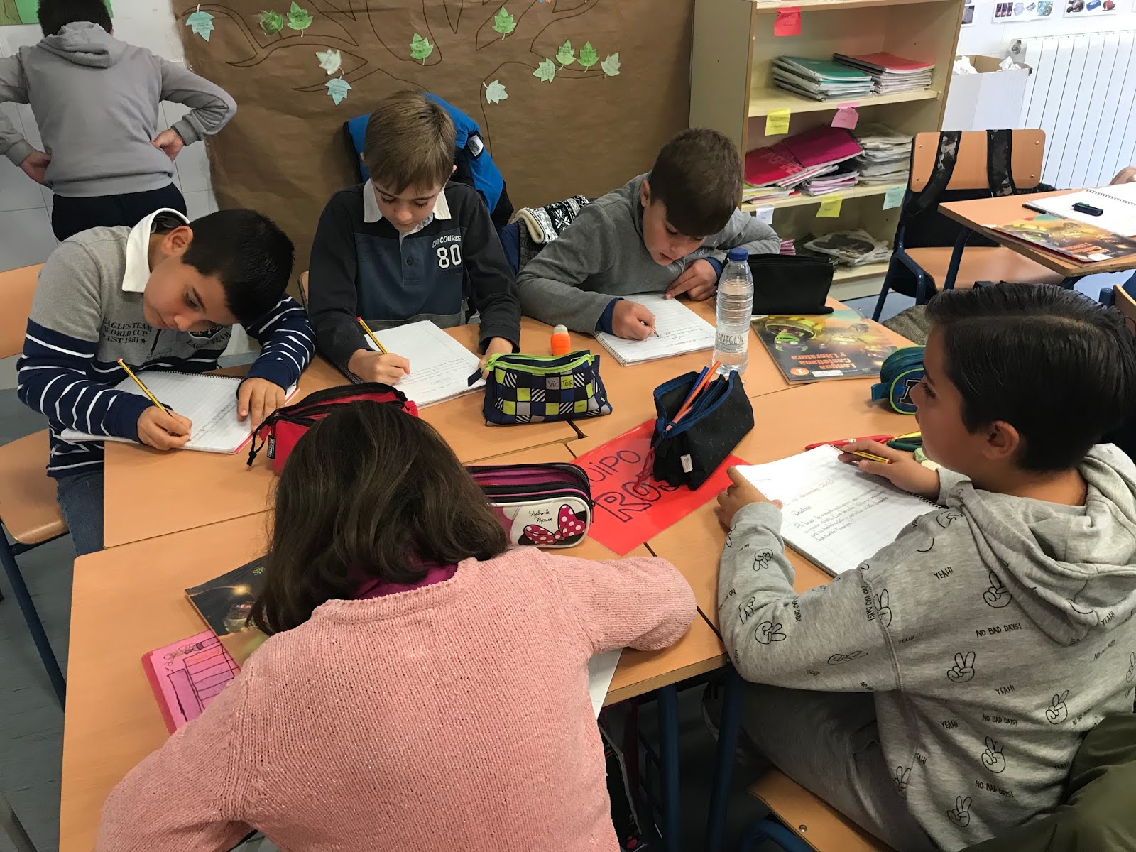 Una vez todo esto estaba preparado, hemos comenzado la actividad. La persona con el número 1 de cada grupo era la encargada de empezar. Tenía que buscar el dictado de su color, memorizar la primera oración y dictarla al resto del grupo. Cuando todos los demás hubieran puesto el punto podía salir la siguiente persona a memorizar la siguiente oración. La condición es que solo se podía ir a memorizar el dictado una vez, así que había que hacerlo bien.
